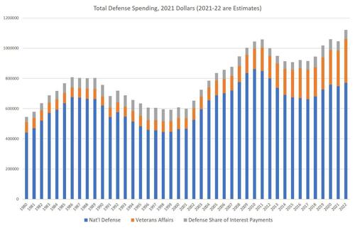 ci mostra come, in base a calcoli del Office of Management and Business della Casa Bianca, il 2022 vedrà la spesa militare statunitense toccare un massimo assoluto dalla fine della Seconda Guerra mondiale, qualcosa come 1,1 trilioni di dollari. Ma per Mead non è sufficiente. A suo modo di vedere, il warfare dovrebbe pesare attorno al 7% del Pil, la media storica nel periodo della Guerra fredda contro l’Urss. Quindi, almeno altri 300 miliardi di spesa extra per pompare un po’ l’asfittico 4% attuale e tornare ai livelli da glory days del Vietnam.