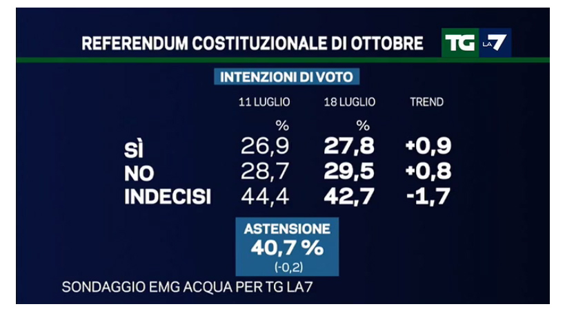 Nei sondaggi politici di oggi, inoltre, sono state analizzate le intenzioni di voto degli italiani sul prossimo referendum costituzionale di novembre. Come ribadiamo ormai da qualche settimana si tratta di un appuntamento elettorale molto importante, poiché gli italiani saranno chiamati alle urne per determinare il futuro del Parlamento italiano. Rispetto agli ultimi sondaggi politici sul referendum, questa settimana il numero degli indecisi è diminuito, quindi la situazione comincia ad essere più definita.