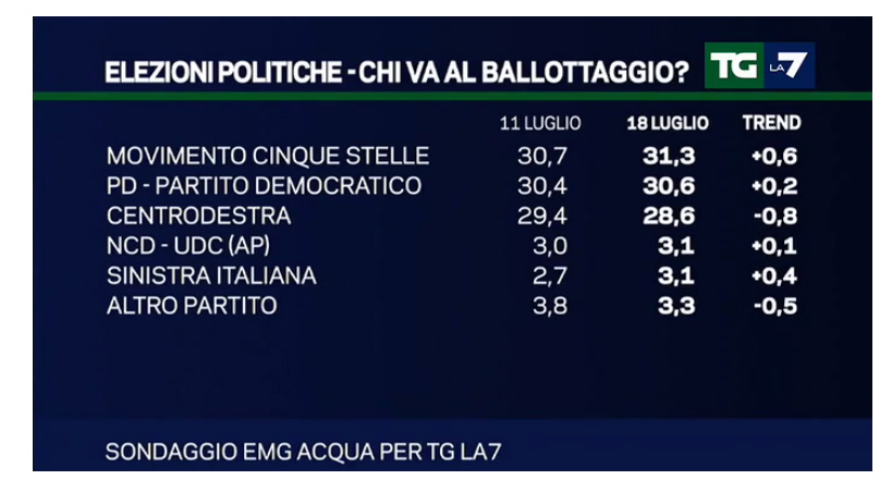 Ma vediamo nel dettaglio quanto rilevato dagli ultimi sondaggi politici condotti dall’istituo EMG Acqua e andati in onda durante il TG La7.