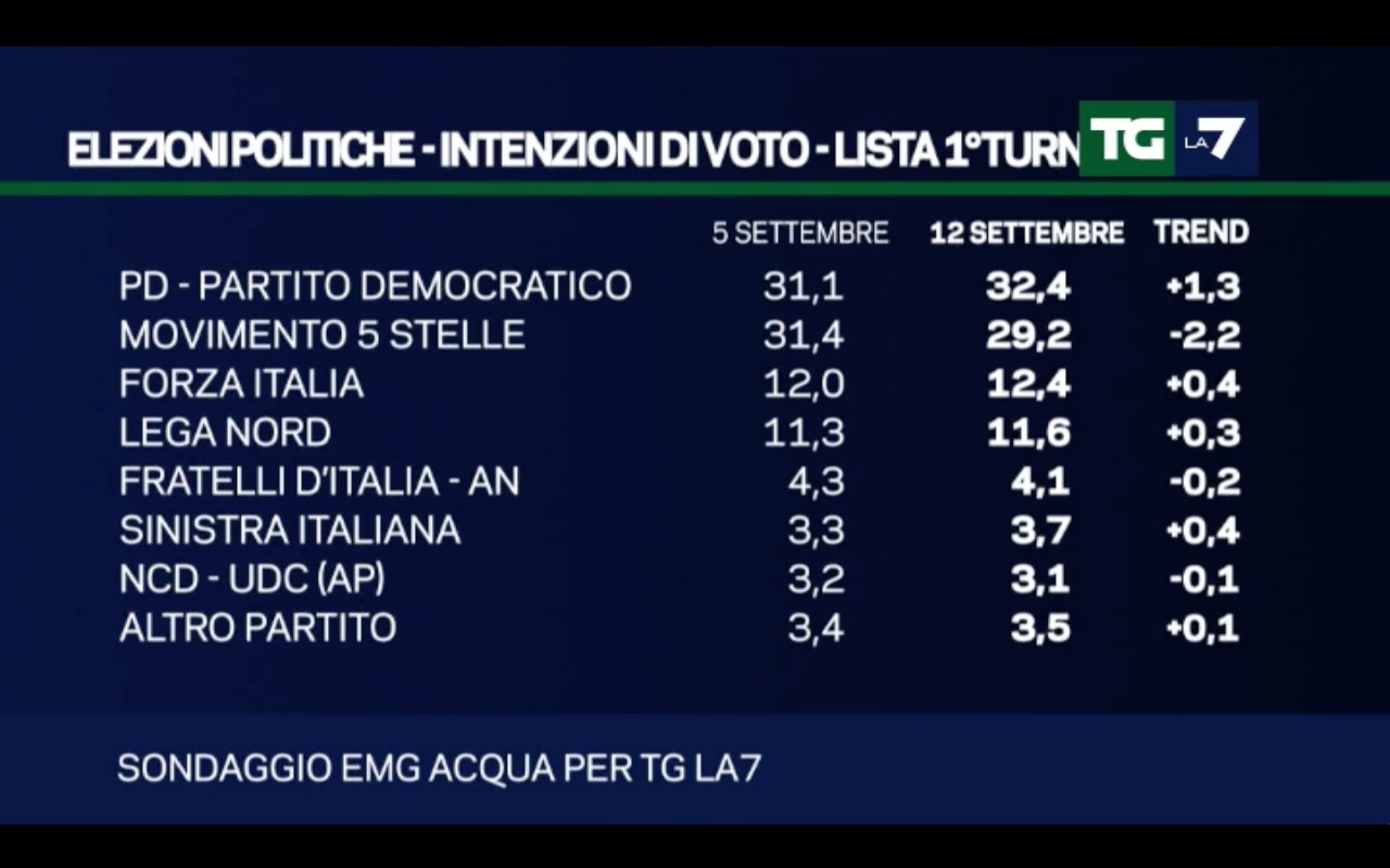 Al flop annunciato dei grillini dopo gli ultimi tumulti mediatici, si affianca di contralto il PD che supera gli avversari politici con uno scatto di +1,3% rispetto ai dati dei precedenti sondaggi politici, mentre il M5S sprofonda a -2,2.