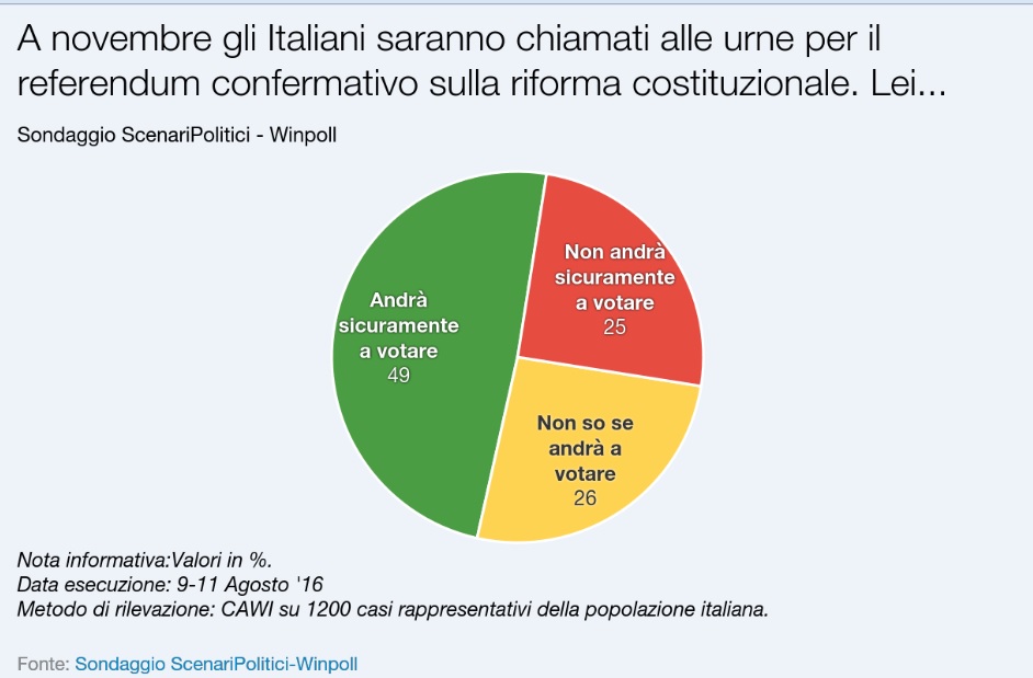 Per quanto riguarda i sondaggi politici relativi al Referendum Costituzionale l’affluenza alle urne secondo Winpoll ad oggi è distribuita come segue: il 49% dei cittadini italiani ha deciso cosa votare, il 25% non andrà, mentre il 26% è indeciso.