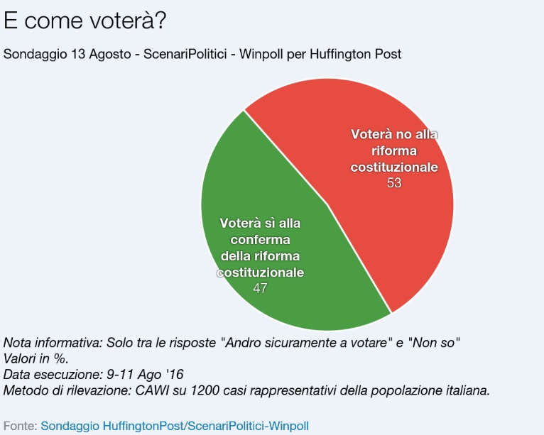 La riforma costituzionale è l’argomento principale che divide il Paese e i risultati di voto del referendum costituzionale sono cambiati poco nell’ultimo periodo: a giugno 2016 i contrari alla riforma erano il 52,1% degli elettori, contro il 47,9% di favorevoli secondo Euromedia, mentre a luglio secondo un sonaggio politico Winpoll il No era al 52,5% in vantaggio sul Sì al 47,7%.