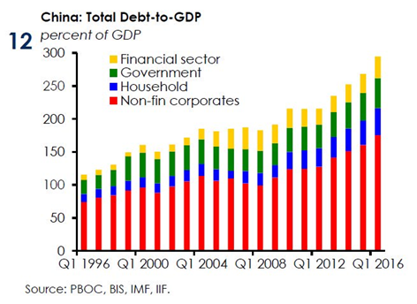 Il fatto di un alto indebitamento non tanto del settore finanziario stesso quanto, piuttosto, delle aziende non finanziarie, sembra confermato dal grafico appena sotto, dove si riportano le componenti del rapporto tra il debito totale ed il PIL tra il primo trimestre 1996 e il primo trimestre 2016 (in giallo il settore finanziario; in verde quello governativo; in blu le famiglie; in rosso il settore non finanziario).