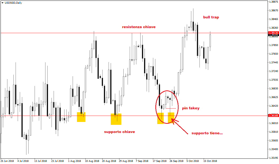 Innanzitutto possiamo notare un’area di supporto posta poco sopra 1,36. Il supporto chiave tiene più volte e lo fa ancora una volta sul finire di settembre 2018, quando avviene un falso breakout di una inside bar. Si forma una pin bar con tanto di bear trap: è la pin fakey. Il segnale è limpidissimo. Si può andare long, anche sul pullback intraday del giorno dopo. Nelle sedute successive i prezzi saliranno tantissimo, fino a raggiungere (e superare per un paio di sessioni) l’area di resistenza di 1,38.