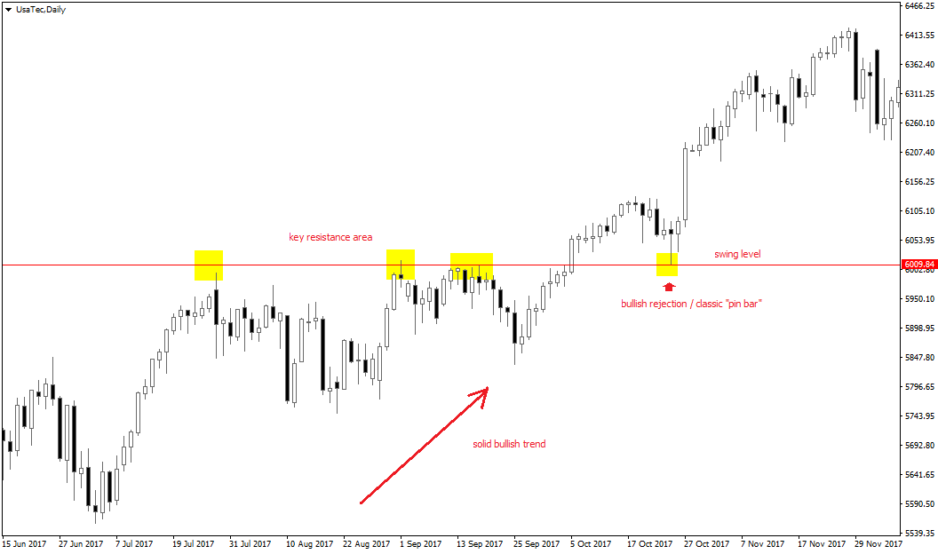 Le pin bar appartengono alla grande “famiglia” delle reversal bar. La caratteristica principale di questo setup a una sola candela è la presenza di un piccolo real body (a volte quasi inesistente) e di una lunga coda, che deve essere almeno un paio di volte l’ampiezza del corpo (quanto più è lunga meglio è). Oggi andiamo a vedere un esempio pratico sul CFD del Nasdaq, esaminato su un time frame daily. Il chart mostrato in basso evidenzia un trend rialzista consolidato, che a un certo punto va a sbattere contro una resistenza importante in area 6mila punti.