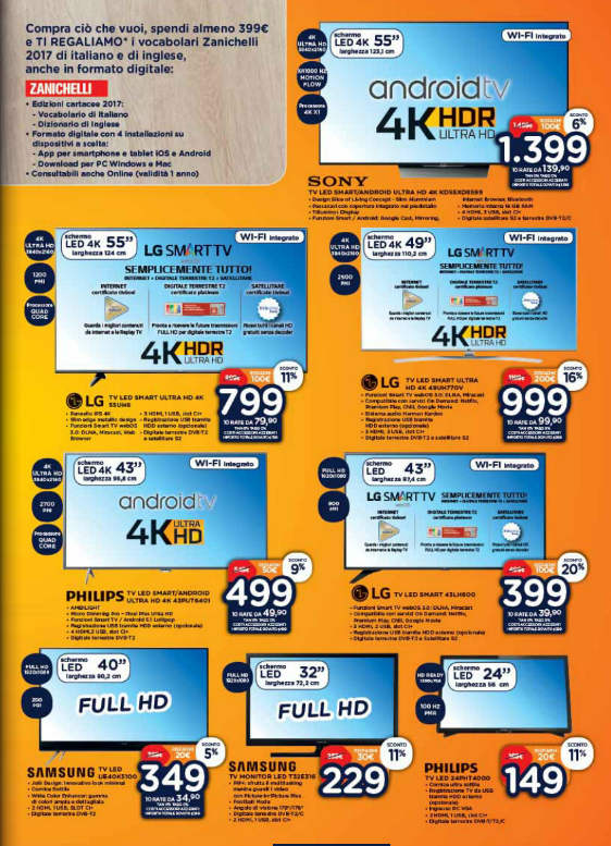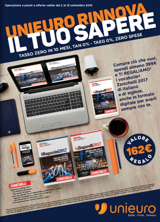 Il volantino Unieuro di settembre 2016 non risparmia nemmeno gli alunni che ritornano a scuola: entro il 15 settembre, acquistando un qualsiasi articolo per un costo di almeno 399 euro, Unieuro dà in regalo il vocabolario della lingua italiana e il vocabolario italiano-inglese e inglese-italiano Zanichelli 2017.