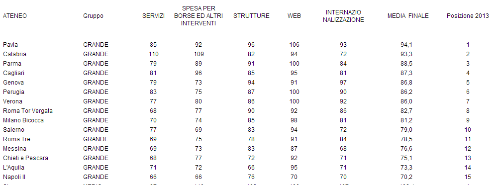 Tra le grandi, e cioè tra le Università che contano un numero di iscritti compreso tra i 20.000 e i 40.000 studenti si conferma la leadership di Pavia, seguita da Calabria e Parma. Scende invece all’ultimo posto la casertana Napoli II.