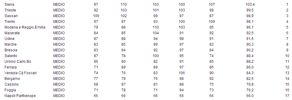 Si modifica invece il podio delle Università medie (da 10.000 a 20.000 iscritti) rispetto al 2012. Prima in classifica ancora Siena, mentre al secondo posto troviamo Trieste che spodesta Trento (scesa al quarto posto). Ultimo gradino del podio per l’Università di Sassari.