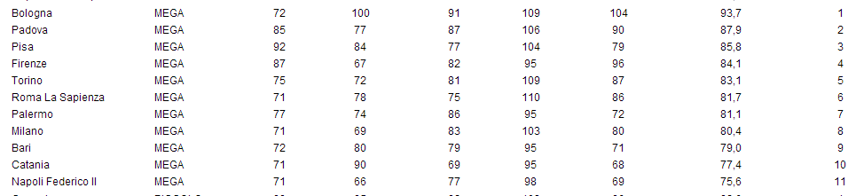Tra i mega vengono inclusi gli Atenei con più di 40.000 iscritti. Ai vertici troviamo ancora l’Università di Bologna e quella di Padova, mentre al terzo posto si situa Pisa che soppianta Firenze e Torino(nel 2012 rispettivamente 3° e 4° posto, nel 2013 4° e 5°.