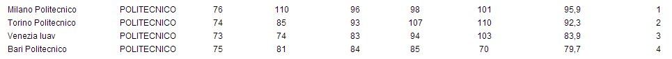 La Leadership incontrastata va al Politecnico di Milano che con un punteggio complessivo di 95,9 guida la classifica.