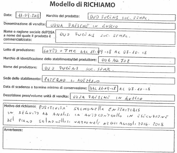 Il ritiro riguarda uova fresche in guscio Fmc prodotte da Avicola Pelligna nello stabilimento di Avezzano (AQ) con data di scadenza o termine minimo di conservazione dall’11 settembre 2018 al 07 ottobre 2018. Per la precisione i lotti in cui è stata ritrovata traccia del batterio sono:
