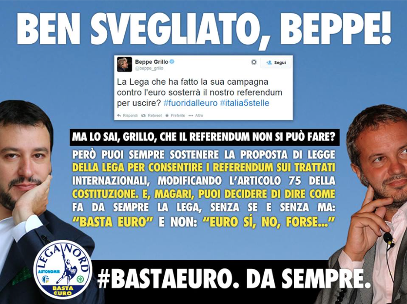 Su una cosa Lega nord e Movimento 5 Stelle sembrano andare d’accordo: sulla necessità per l’Italia di uscire dalla moneta unica. I due movimenti però si contendono le bandiera dell’uscita dall’euro e rivendicano il primato di movimento euroscettico in Italia. La Lega, sostenuta dall’economista Borghi, porta avanti da tempo la battaglia contro la moneta unica. E Beppe Grillo in occasione dei 3 giorni al Circo Massimo ha lanciato una raccolta firme per un referendum sull’uscita dall’euro. Ma la Lega nord con un post al veleno, ricorda che non è possibile uscire dall’euro tramite referendum.
