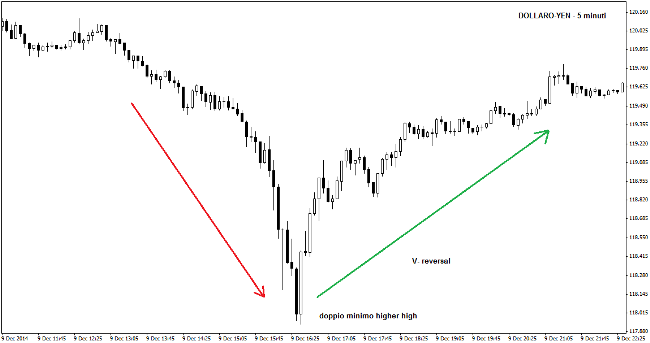 Ad esempio, considerando l’esempio grafico mostrato in alto, possiamo impiegare l’affidabile doppio minimo higher high, che identifica con precisione un potenziale bottom del mercato. Il grafico intraday del tasso di cambio dollaro/yen, time frame a 5 minuti, mostra proprio questo pattern alla fine del bearish trend e tutti gli swing relativi alla V-Reversal intraday. Grazie a questi pattern, il mercato tornerà praticamente al punto di partenza, ovvero sull’area di prezzo dalla quale era iniziata la forte discesa delle quotazioni.