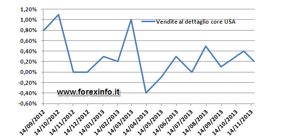 Alle 14:30 ora italiana sono usciti i dati sulle vendite al dettaglio core degli Stati Uniti per il mese di Novembre, pubblicati mensilmente dal Census Bureau. Il dato effettivo è pari a +0,4%, mentre le attese si concentravano intorno ad un +0,2%, pari al dato di Ottobre.