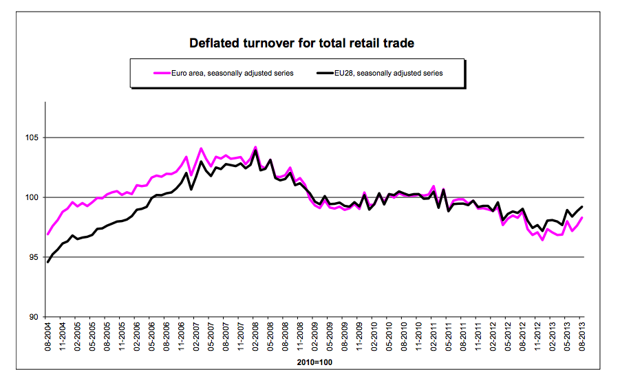 Secondo le statistiche ufficiali elaborate dall’Eurostat , il commercio al dettaglio per l’area euro a 17 (EA 17) è cresciuto del 0.7% ad Agosto rispetto a Luglio 2013, mentre per l’area euro a 28 paesi (EA 28) l’indice ha fatto registrare un incremento dello 0.4%.