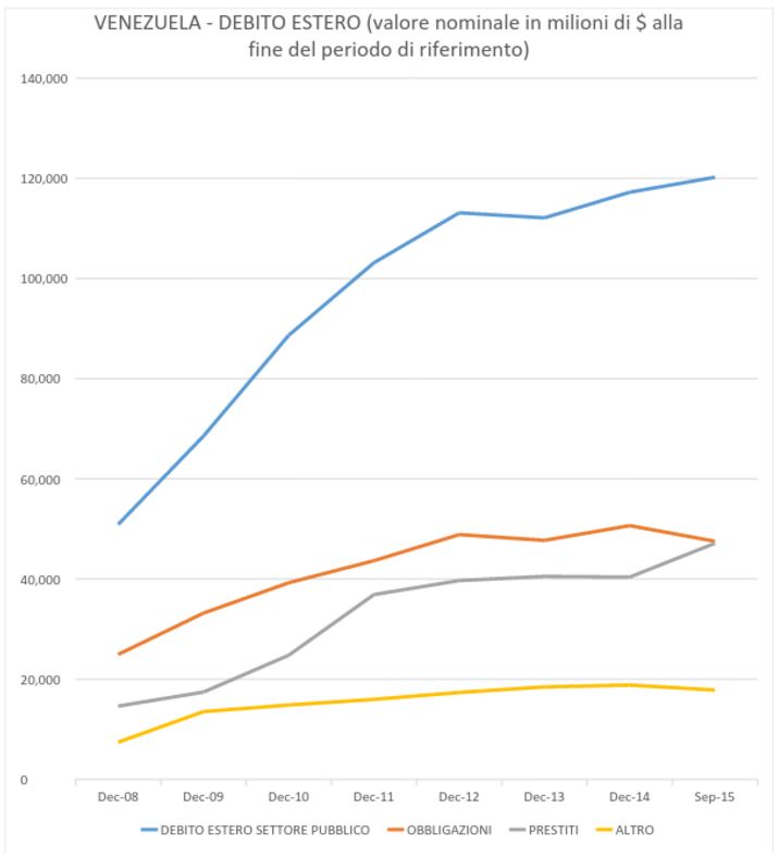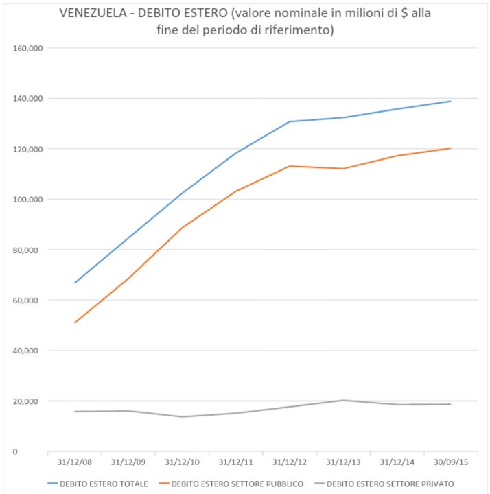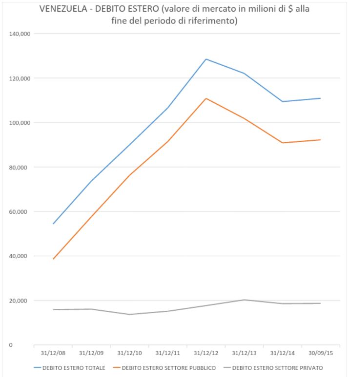 Altri dati interessanti, pubblicati sempre dalla Banca Centrale del Venezuela, riguardano il debito estero, sia nominale che a valori di mercato; da questi si evince come il debito estero del Venezuela sia nella stragrande maggioranza accumulato dal settore pubblico e non da quello privato.