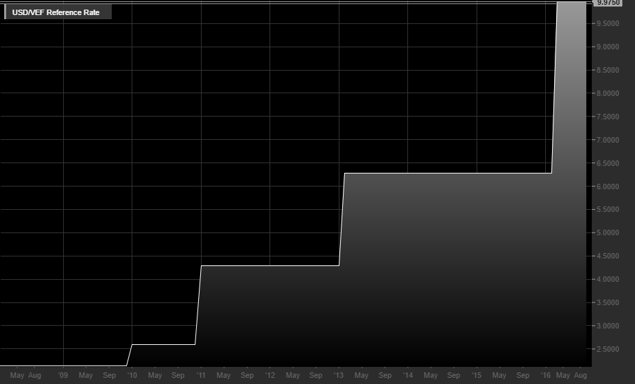 Il grafico sottostante fa vedere come si è mosso il cambio tra il bolivar fuerte ed il dollaro americano nel corso degli ultimi anni. Le svalutazioni evidenziano i momenti in cui il Banco Central de Venezuela non è stato più in grado di “tenere” il cambio prefissato e ha dovuto svalutare la valuta nazionale.