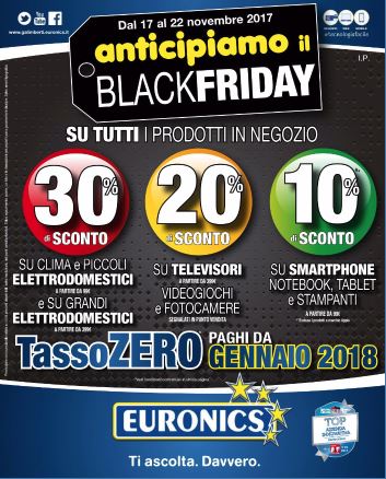 Il Black Friday di Euronics ha finalmente inizio: dopo il volantino del Black November, con tante offerte vantaggiose, sono state pubblicate delle nuove offerte - valide dal 23 al 27 novembre 2017 - con sconti che raggiungono persino il 50%.