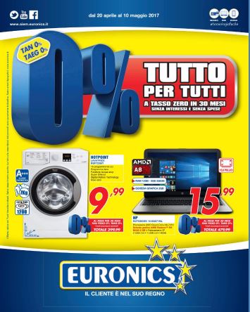 I negozi Euronics del gruppo Siem aderiscono alla campagna offerte del volantino 0% Tutto per Tutti, che consente di acquistare migliaia di articoli a tasso zero in 30 mesi senza interessi e senza spese. Ad esempio il notebook HP da 15,5 pollici con processore AMD Quad-Core A8, RAM 12GB espandibile fino a 256GB e scheda grafica da 2GB costa 479,99€ ma si può comprare in 30 rate da 15,99€ al mese TAN fisso 0% e TAEG 0%.