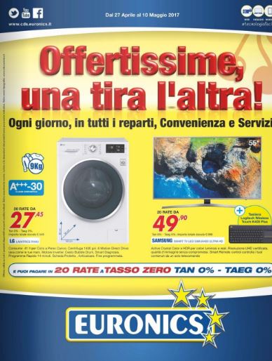 Questo volantino si intitola “Offertissime, una tira l’altra” e consiste nella possibilità di scegliere i prodotti tech ed elettrodomestici pagando in 20 rate a tasso zero Tan 0% e Taeg 0%. Cosa troviamo in offerta? In prima pagina Euronics ci propone una lavatrice LG classe A+++ con capienza 41 litri e vari programmi smart. Il costo totale è di 549€, ma si può pagare in 20 rate da 27,45 euro. Accanto troviamo la Smart TV LED UHD Samsung da 55" acquistabile in 20 rate da 49,90€ e compresa nel prezzo c’è una tastiera Logitech wireless Touch.
