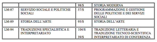specialistica/magistrale in uno dei Corsi di laurea specialistica/magistrale indicati nella tabella seguente; - aver conseguito la laurea quadriennale (ex L. 341/90) in uno dei seguenti Corsi dal 1 giugno 2013: