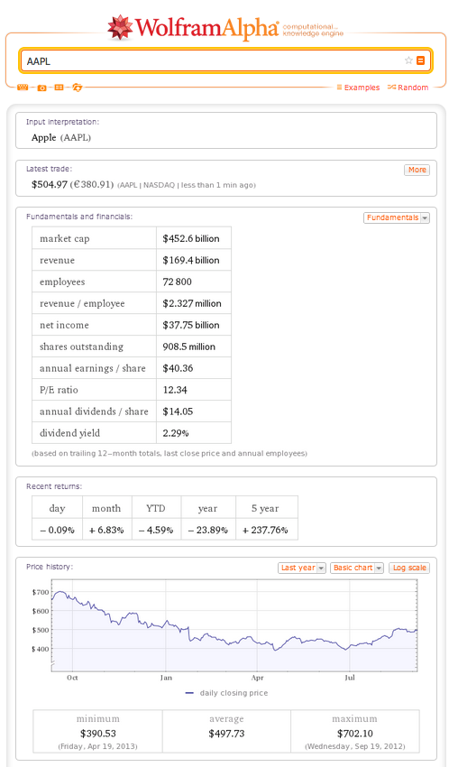 Digitando il nome di una particolare compagnia che intendiamo analizzare, WolframAlpha ci fornisce istantaneamente una serie di dati tutti in una sola ed unica pagina, rendendo semplicissima la ricerca di dati storici e statistici.