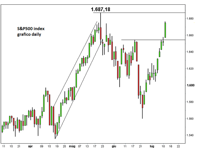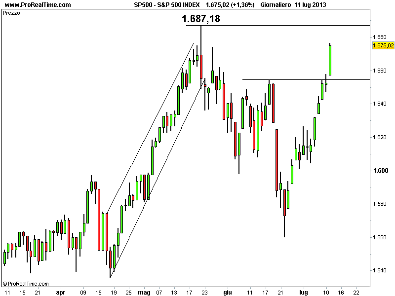 In grande spolvero troviamo anche l’indice S&P500, che ieri ha chiuso con un rialzo dell’1,36% a 1.675,02 punti ai massimi da 7 settimane. L’indice è a un passo dal raggiungimento del precedente massimo storico posto a 1.687,18 punti, toccato lo scorso 22 maggio. Il proseguimento della politica monetaria accomodante della FED favorisce ancora l’assunzione di rischi e l’azionario americano diventa il primo beneficiario di questa linea strategica dell’istituto monetario di Washington.