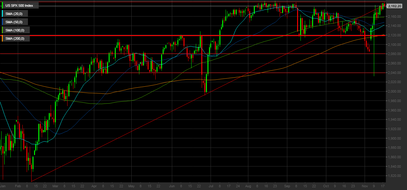 L’S&P500 si dirige di nuovo verso i massimi storici di fine estate in area 2190$. Al momento la resistenza ha respinto le quotazioni che non vanno oltre i 2182 punti registrando una flessione dello 0,2% circa nella giornata di venerdì.