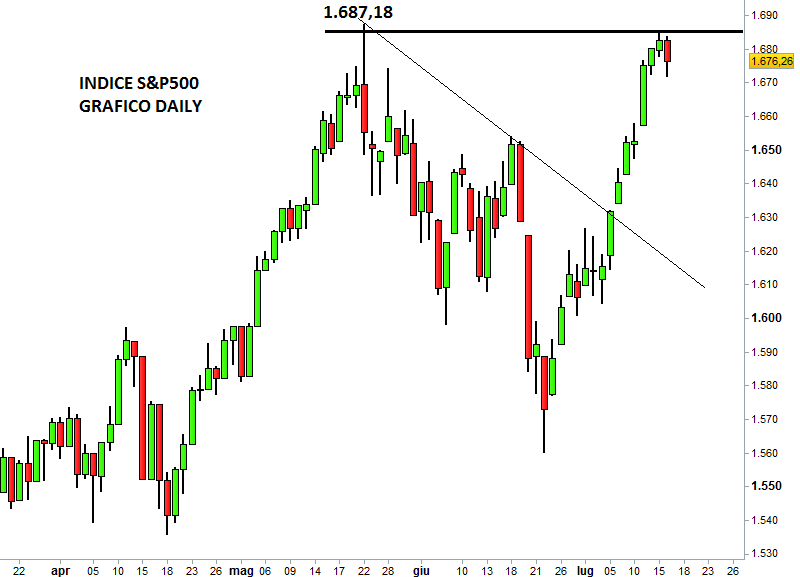 Ieri avrà pure frenato dopo la corsa degli ultimi giorni, ma l’indice azionario americano S&P500 è davvero molto vicino al raggiungimento dei precedenti massimi storici. Ieri a Wall Street l’indice ha chiuso con un calo dello 0,37% a 1.676,26 punti. Il record di sempre è stato toccato il 22 maggio scorso a 1.687,18 punti. Il leggero calo di ieri interrompe una striscia positiva che andava avanti dal 3 luglio ( 8 sedute consecutive in rialzo). Ieri sono scattate le prese di beneficio, in attesa dell’audizione di Bernanke alla Camera (ore 16) e della diffusione del Beige Book della FED (ore 20).