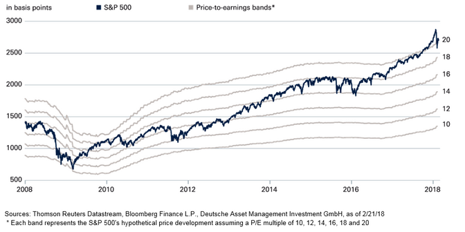 Oggi il P/E corrente dell’S&P 500 è pari a circa 22, la stima sul 2018 vede l’indicatore a 17,6 e quella 2019 a 15,9 (fonte: Bloomberg LP). Come interpretare questi valori? La casa d’affari tedesca viene incontro a chi volesse dirimere questi dubbi con un esempio storico lampante: