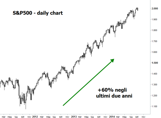 Poca roba se si pensa che da inizio anno la performance risulta positiva per il 7,4%, mentre negli ultimi due anni l’indice principale della borsa americana ha messo a segno un rialzo da capogiro di oltre sessanta punti percentuali. Dai bottom di marzo 2009 (da area 666, numero piuttosto inquietante, ndr), invece, l’indice S&P500 ha realizzato un guadagno stratosferico del 198%.