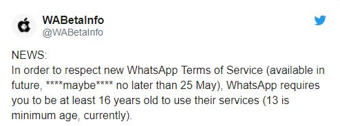Qualche giorno fa su Twitter @WABetaInfo ha annunciato che il popolare servizio di messaggistica attuerà nuovi termini e condizioni, reintroducendo l’età minima di 16 anni. Attualmente per utilizzare la piattaforma bisogna avere almeno 13 anni. Si legge anche che questa novità, disponibile in futuro, potrebbe arrivare forse entro il 25 maggio.