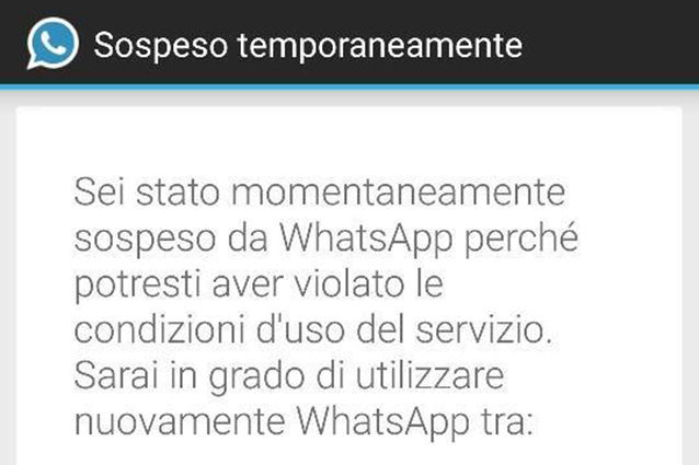 “Sei stato momentaneamente sospeso da WhatsApp perché potresti aver violato le condizioni d’uso del servizio. Sarai in grado di utilizzare nuovamente WhatsApp tra 24 ore”.