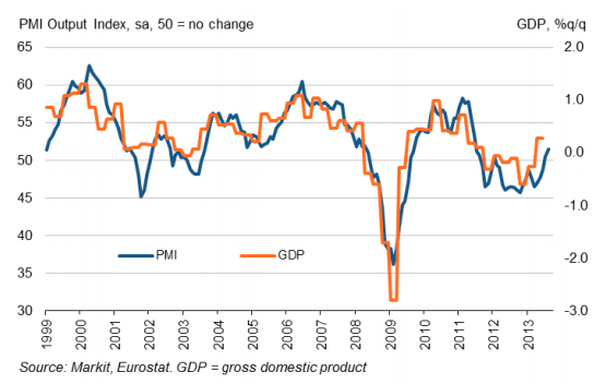 Nel mese di agosto, l’indice che misura l’attività delle aziende ha riportato un valore di 51.5 punti, in aumento rispetto ai 50.5 del mese di luglio. Secondo Chris Williamson, capo economista Markit, "il recupero economico dell’Eurozona sembra essere sempre più consistente, con più settori e paesi che riescono ad emergere dalla recessione."