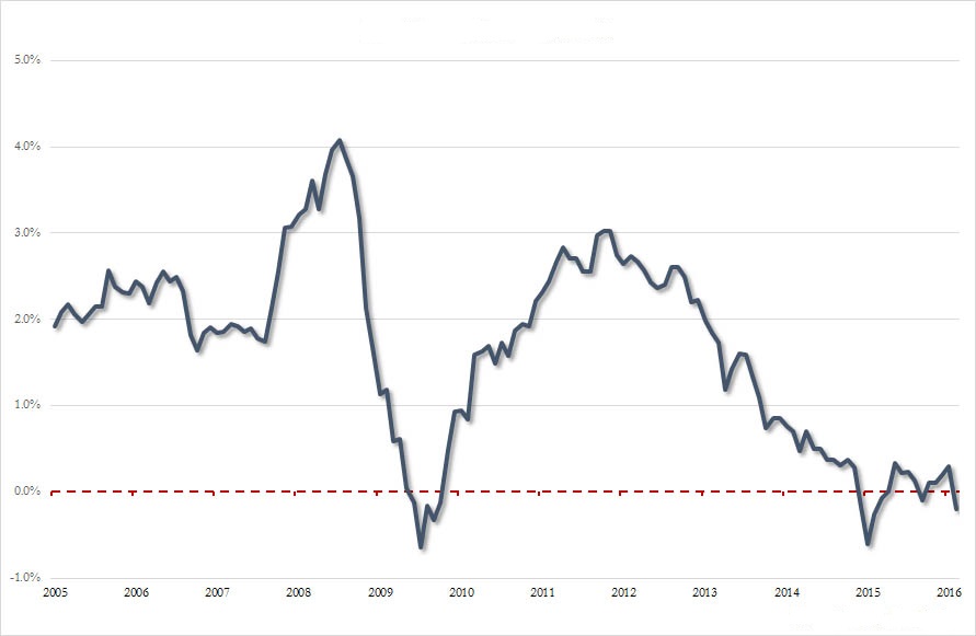 Dal grafico sottostante è possibile vedere l’andamento dell’inflazione che, come si può notare, è tornata sotto lo 0% nonostante le politiche accomodanti della BCE.
