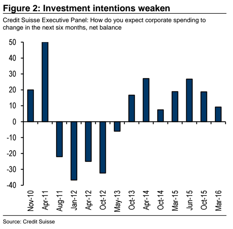 Un sondaggio elaborato direttamente da Credit Suisse sulle intenzioni di spesa delle società mostra come le aziende abbiano hanno tagliato i piani di spesa futura.