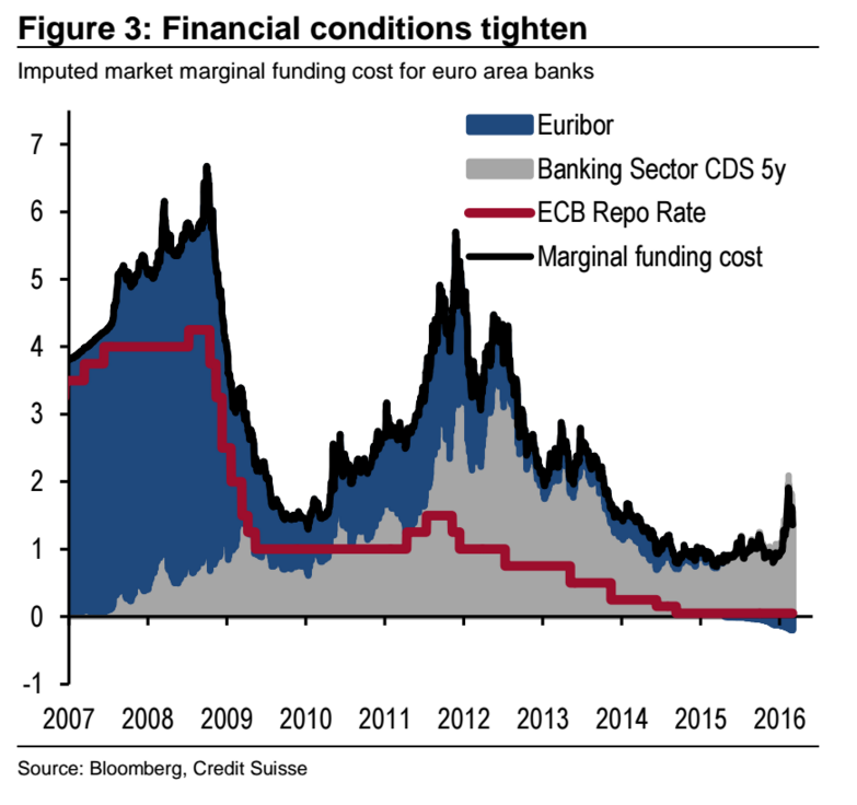 Credit Suisse scrive che le condizioni dei mercati finanziari sono peggiorate. Lo stress causato dal debito incerto delle banche e la discesa delle azioni del comparto bancario hanno rallentato gli effetti sulla crescita provenienti dall’allentamento della politica monetaria.