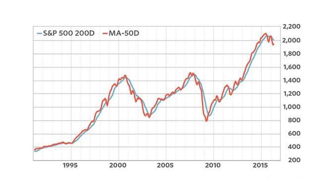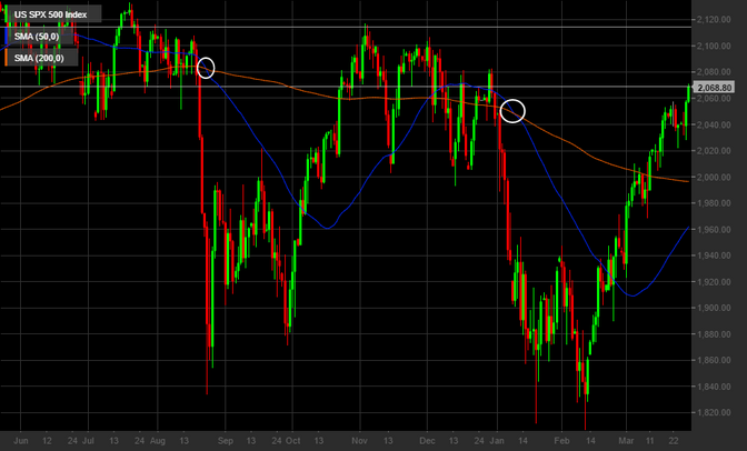 Nel dettaglio, l’indicatore in questione è composto da due medie mobili semplici: una di breve a 50 periodi e una di lungo a 200 periodi. L’incrocio di queste due medie quest’anno e in passato ha sempre fornito ottimi segnali predittivi sull’andamento dello Standard, riuscendo a prevedere in anticipo movimenti a ribasso e a rialzo dell’indice americano.