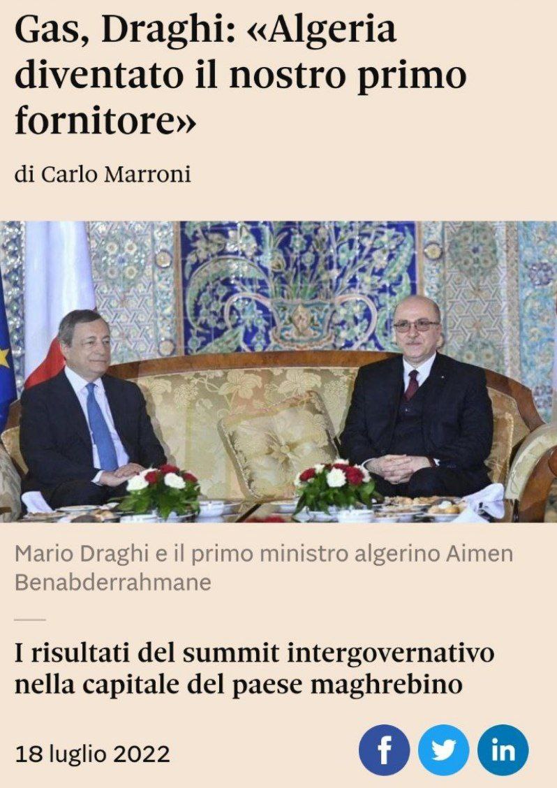 ovvero, il fatto che proprio oggi l’Algeria ha ufficialmente presentato richiesta di adesione ai BRICS. Tradotto, Algeri chiede a Cina e Russia di far parte del loro club. Casualmente, si tratta del medesimo Paese divenuto dal luglio scorso il nostro fornitore primario di gas, la nostra ancora di salvezza e garanzia strutturale di affrancamento da Gazprom. Almeno, come tale ci era stato spacciato dopo il viaggio taumaturgico dell’ex primo ministro, Mario Draghi.