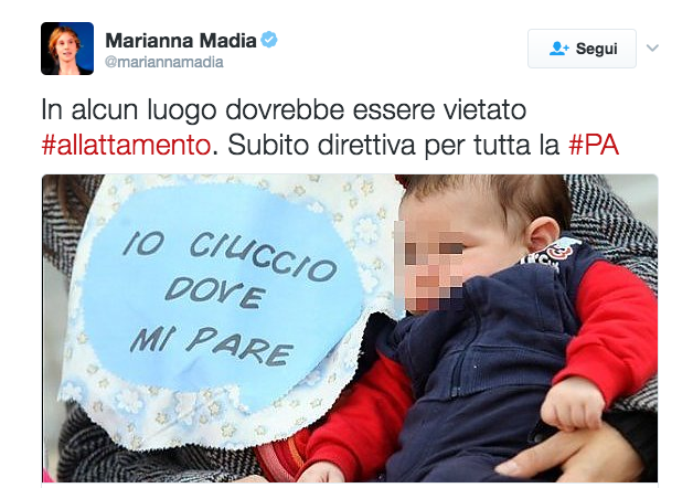 La direttiva firmata dal Ministro della Pubblica Amministrazione Marianna Madia stabilisce una volta per tutte che non esiste alcun divieto di allattare al seno i propri figli in uffici pubblici, e tutti gli uffici dovranno adottare comportamenti idonei a non ostacolare le esigenze di allattamento delle neo mamme.