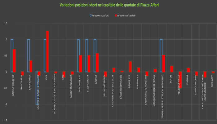 Terna invece è il terzo titolo in termini di variazione negativa rispetto alla scorsa ottava: qui i fondi incrementano la loro esposizione di una posizione netta short e dello 0,51% sul capitale sociale.