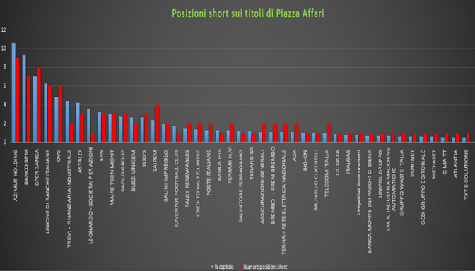 Nella classifica aggregata invece, come anticipato prima, Azimut risulta la società che più subisce la fame di short degli operatori istituzionali. Il gruppo di consulenza e gestione patrimoniale presenta 9 posizioni nette corte in essere e il 10,56% di capitale sociale tenuto sotto la morsa dei fondi.