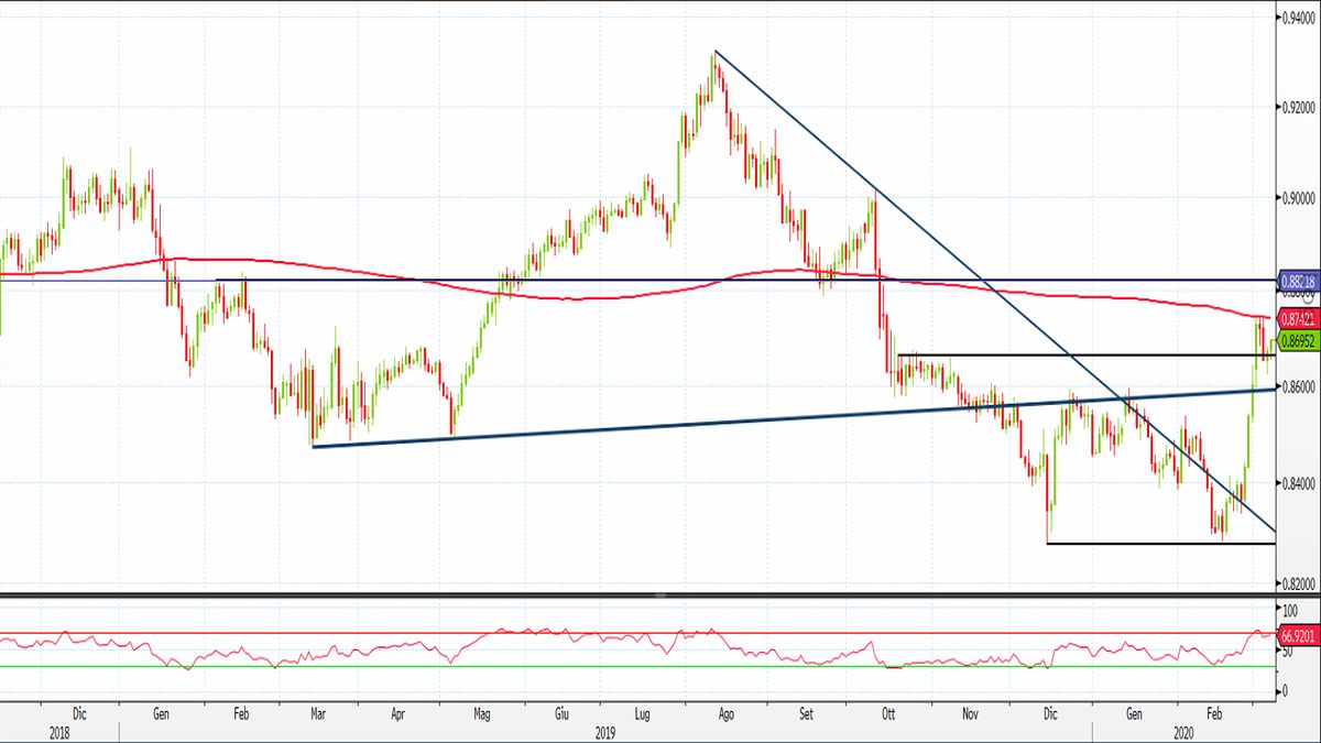 La ripartenza è iniziata dopo la rottura della linea di tendenza che unisce i massimi del 12 agosto e del 10 ottobre 2019, con i prezzi che sono riusciti a completare un modello di double bottom a 0,82769. La salita in essere ha permesso agli acquirenti di passare sia al di sopra della linea di tendenza che unisce i minimi del 13 marzo e del 6 maggio 2019, che del livello orizzontale a 0,8663 (re-testato tra ieri e oggi).