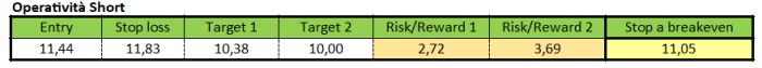 Alla luce della struttura tecnica di breve e medio periodo si potrebbero implementare strategie di matrice ribassista ma soltanto alla rottura del minimo di ieri a 11,44 euro per azione con stop loss posizionato sul massimo di seduta a 11,83 euro. Un primo obiettivo potrebbe essere identificato nei pressi dei minimi registrati nelle sedute del 20 e del 22 novembre rispettivamente a 10,38 e 10,44 euro per azione. Un target finale potrebbe invece essere identificato sulla soglia psicologica dei 10 euro.