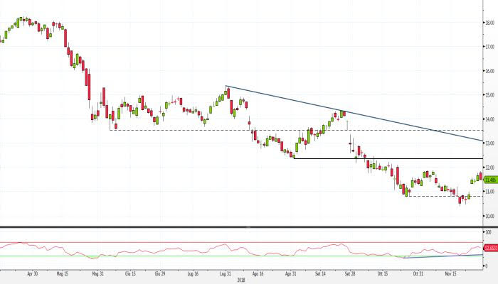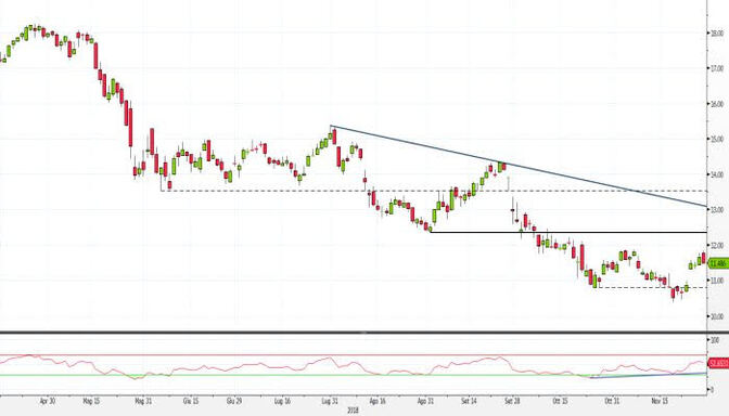 Il trend di lungo periodo rimane ribassista anche con la formazione degli ultimi minimi registrati il 25 ottobre e il 20 novembre rispettivamente a 10,79 euro e a 10,38, si è assistito ad una generale perdita di momentum che potrebbe indicare che è imminente un movimento correttivo più marcato dai livelli attuali nel caso di una chiusura al di sopra del livello statico precedente menzionato. Questo è evidenziato molto bene inoltre dalla divergenza visibile tramite l’indicatore RSI.