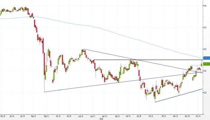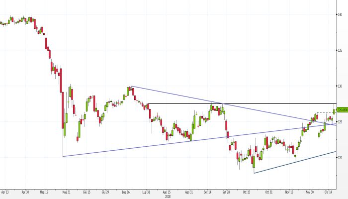 Le due trendline recentemente violate con la candela dalle implicazioni rialziste del 18 dicembre, contano per quella discendente i massimi segnati il 19 luglio a 129,97 con i successivi massimi registrati nelle sedute del 18 e del 26 settembre, rispettivamente a 127,70 e a 127,44 punti.