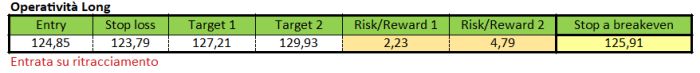 La trendline ascendente, invece, conta il minimo registrato nella seduta del 29 maggio a 120,10 punti che collega il minimo segnato il 3 settembre a 122,35 punti, ora transitante a 124,80 punti.