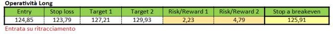 Alla luce della recente ripresa delle quotazioni del decennale italiano si potrebbero privilegiare posizioni long a ridosso dell’area supportiva delimitata dalle due trendline supportive ora transitanti 124,85 e 124,64. In tal caso lo stop loss potrebbe essere collocato sotto il minimo registrato con la candela marubozu del 12 dicembre a 123,79 punti. Un primo obiettivo di profitto potrebbe essere identificato dapprima a ridosso della media mobile semplice a 200 giorni a 127,21, mentre un target finale potrebbe essere collocato in prossimità dei massimi registrati il 18 luglio a 129,93 punti.
