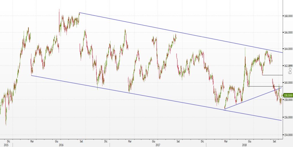 In un’ottica di più lungo periodo va evidenziato che il bund sta oscillando all’interno di un canale discendente delimitato nella sua parte inferiore dalla trendline che collega i minimi decrescenti segnati nel 2016 e testati nuovamente nel marzo del 2018, mentre nella sua parte superiore dalla trendline ora transitante a 163,45 euro che collega i massimi segnati nel settembre 2016 e i recenti massimi segnati ad agosto.
