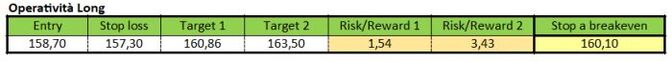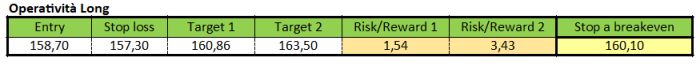 Lo stop loss andrebbe posizionato a 157,30, poco al di sotto del minimo segnato con la seduta del 5 ottobre scorso.